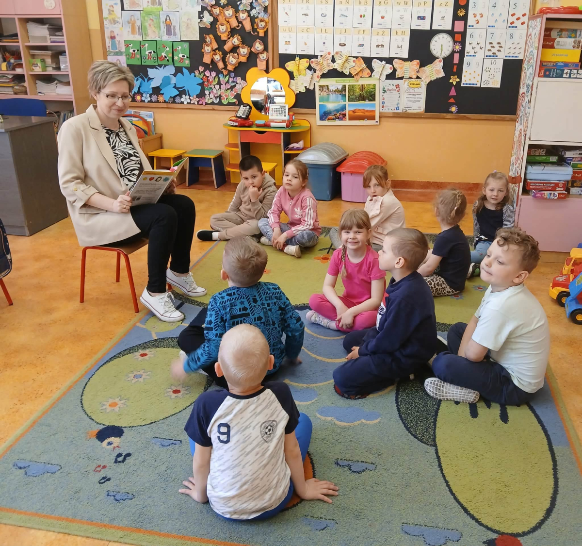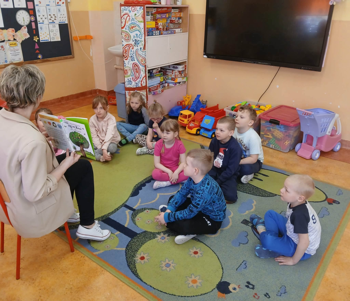 Pani Iza przybliżyła przedszkolakom świat przyrody, czytając wiersze, które w prosty i ciekawy sposób uczą jak dbać o środowisko. Dzieci słuchały z dużym zainteresowaniem, a także chętnie dzieliły się swoimi pomysłami jak należy dbać o naturę.