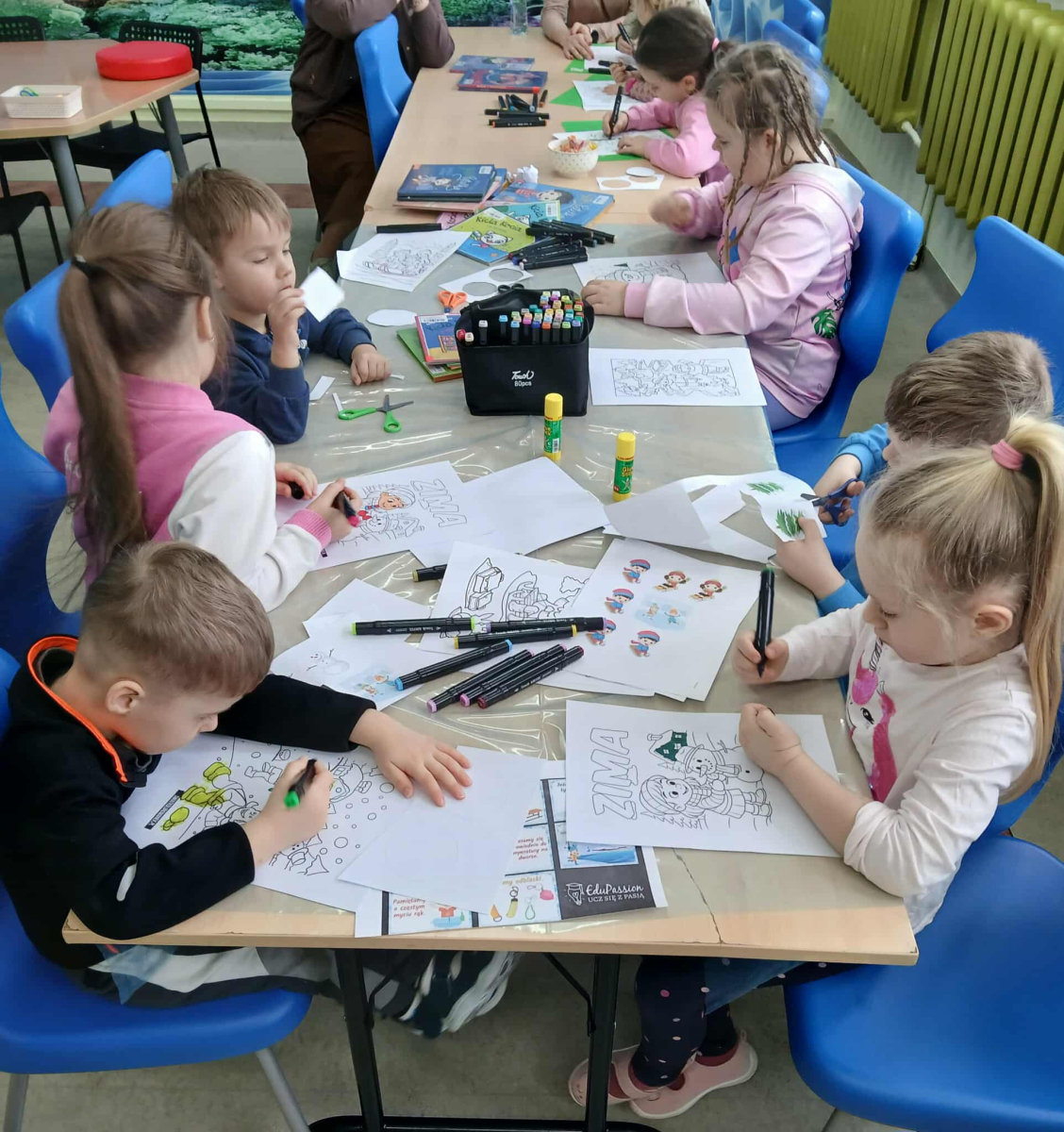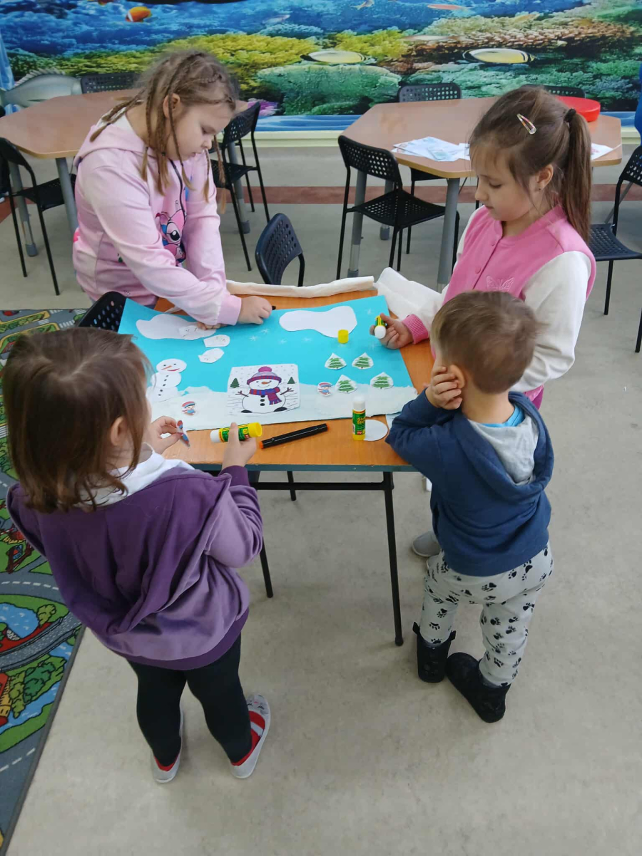 Później dzieci tworzyły zimowe prace plastyczne - kolorowały bałwanki, zimowe krajobrazy oraz różnorodne kolorowanki związane z tematem zimy i bezpieczeństwa. Podczas zajęć rozmawiały o swoich feriach, dzieliły się wrażeniami i planami na nadchodzące dni.