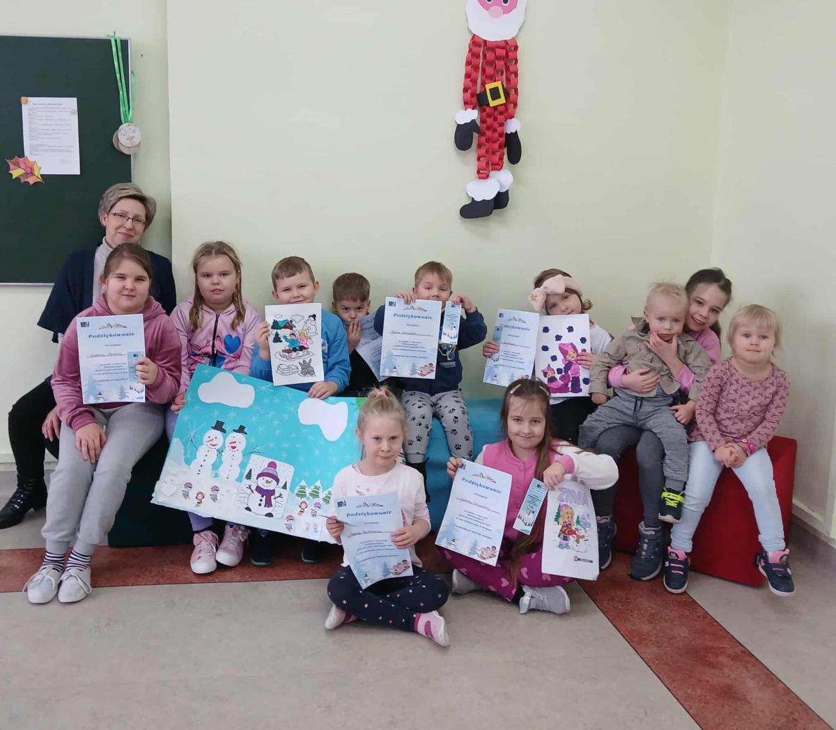 Na zakończenie dzieci otrzymały dyplomy i drobne upominki . Całe spotkanie było pełne radości i zimowej atmosfery .