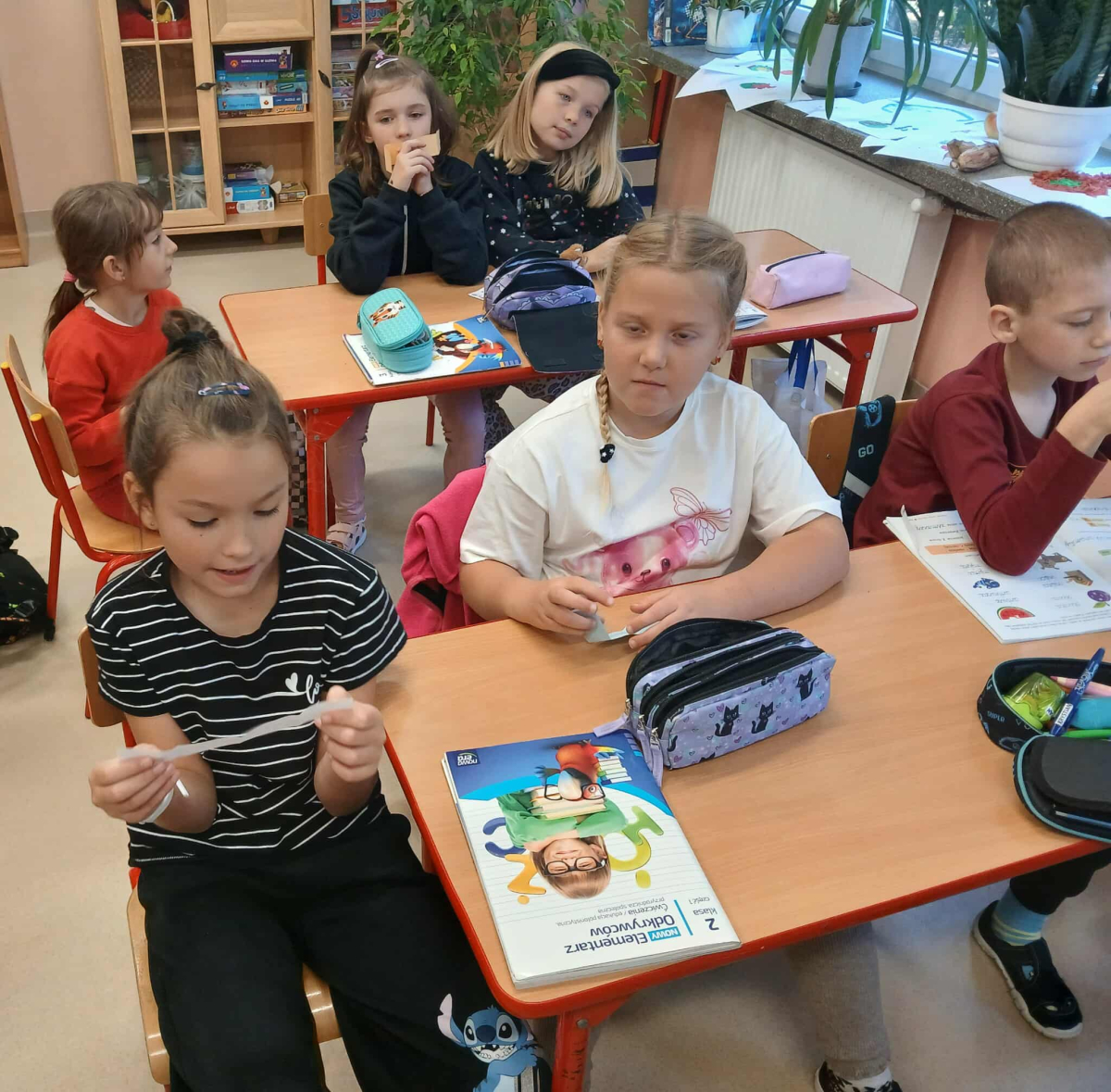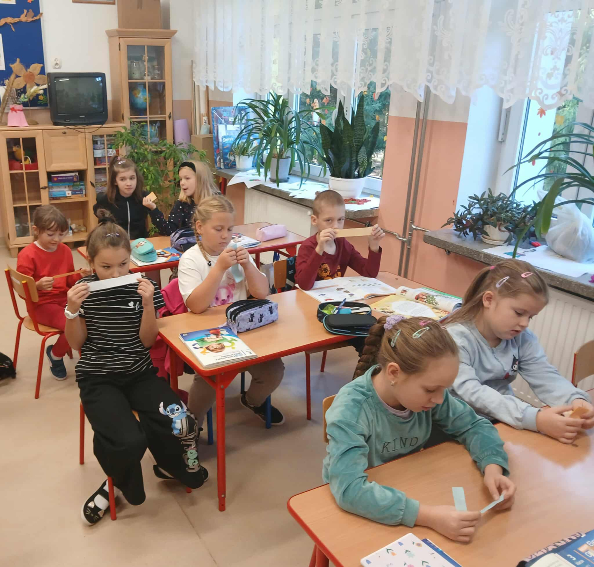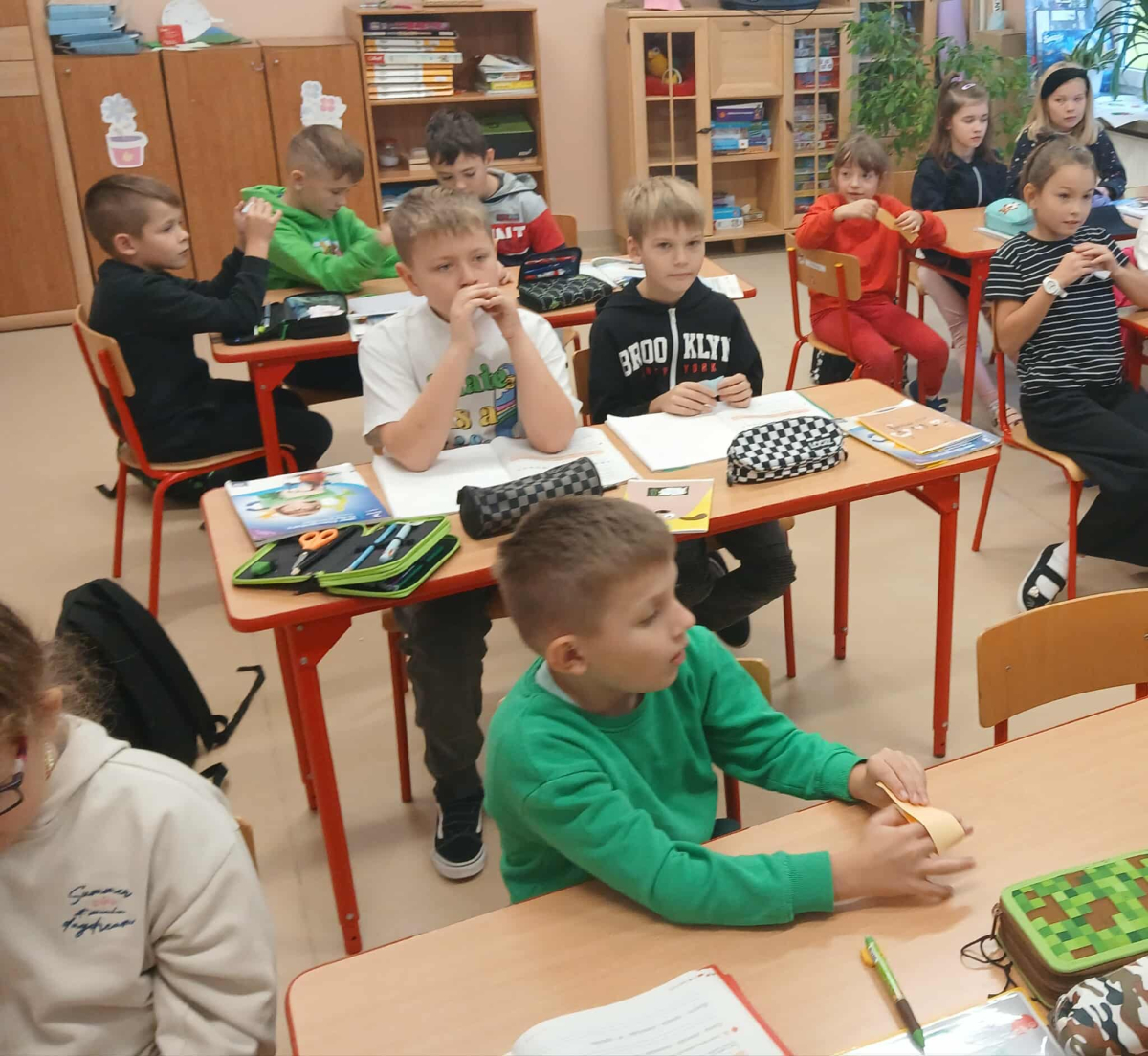 Kolejną atrakcją były jesienne zagadki , które sprawiły uczniom wiele radości. Dzieci świetnie sobie poradziły, wykazując się spostrzegawczością i wiedzą o tej porze roku.