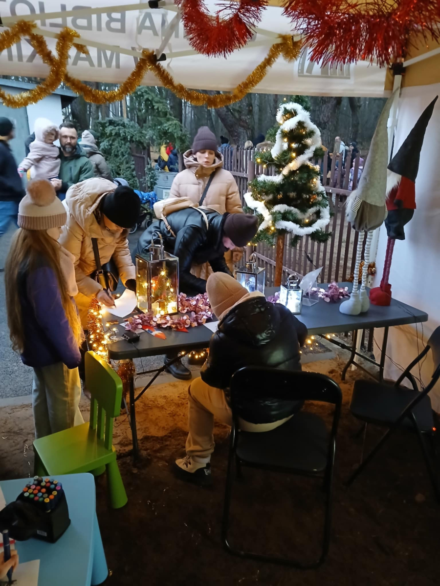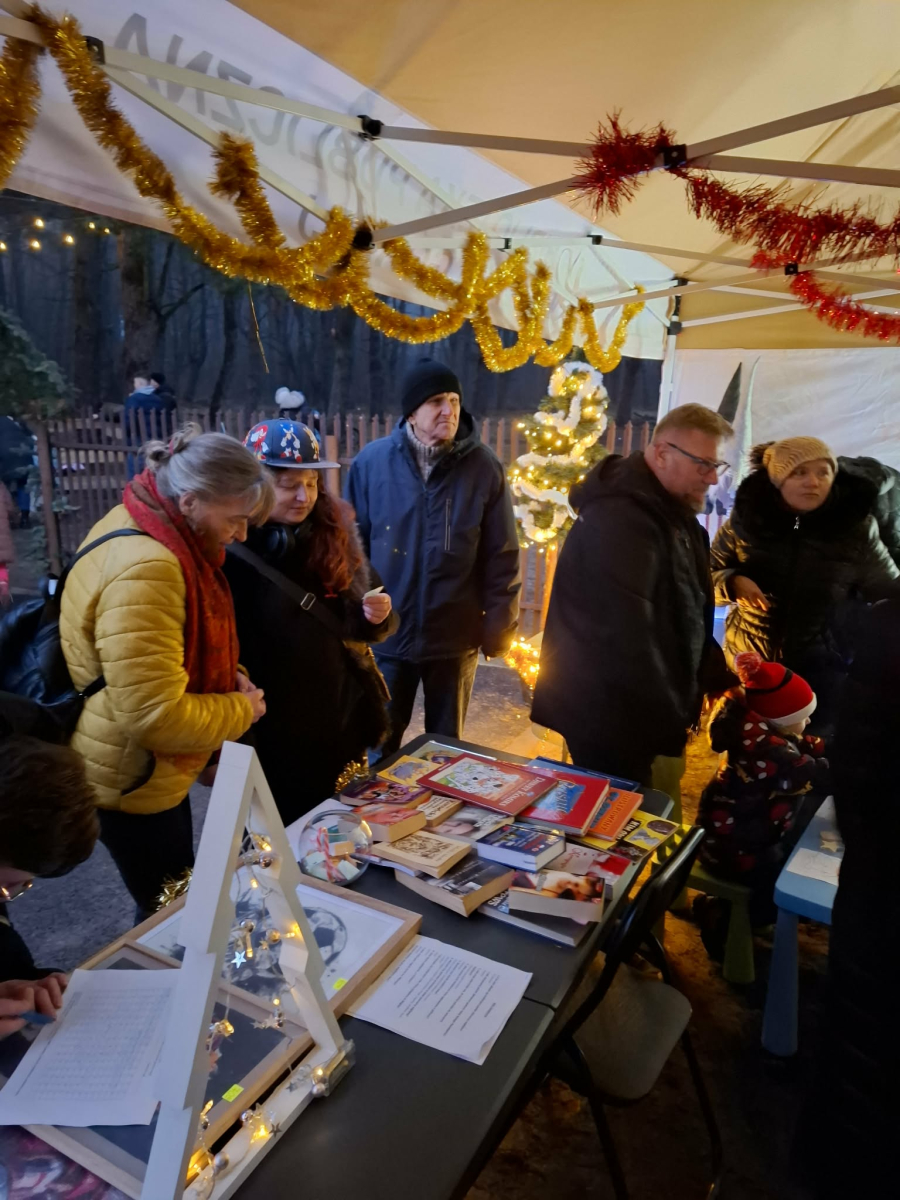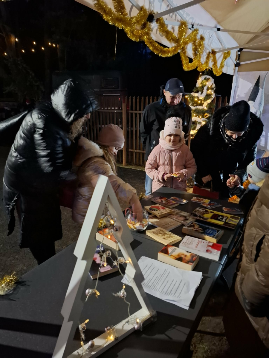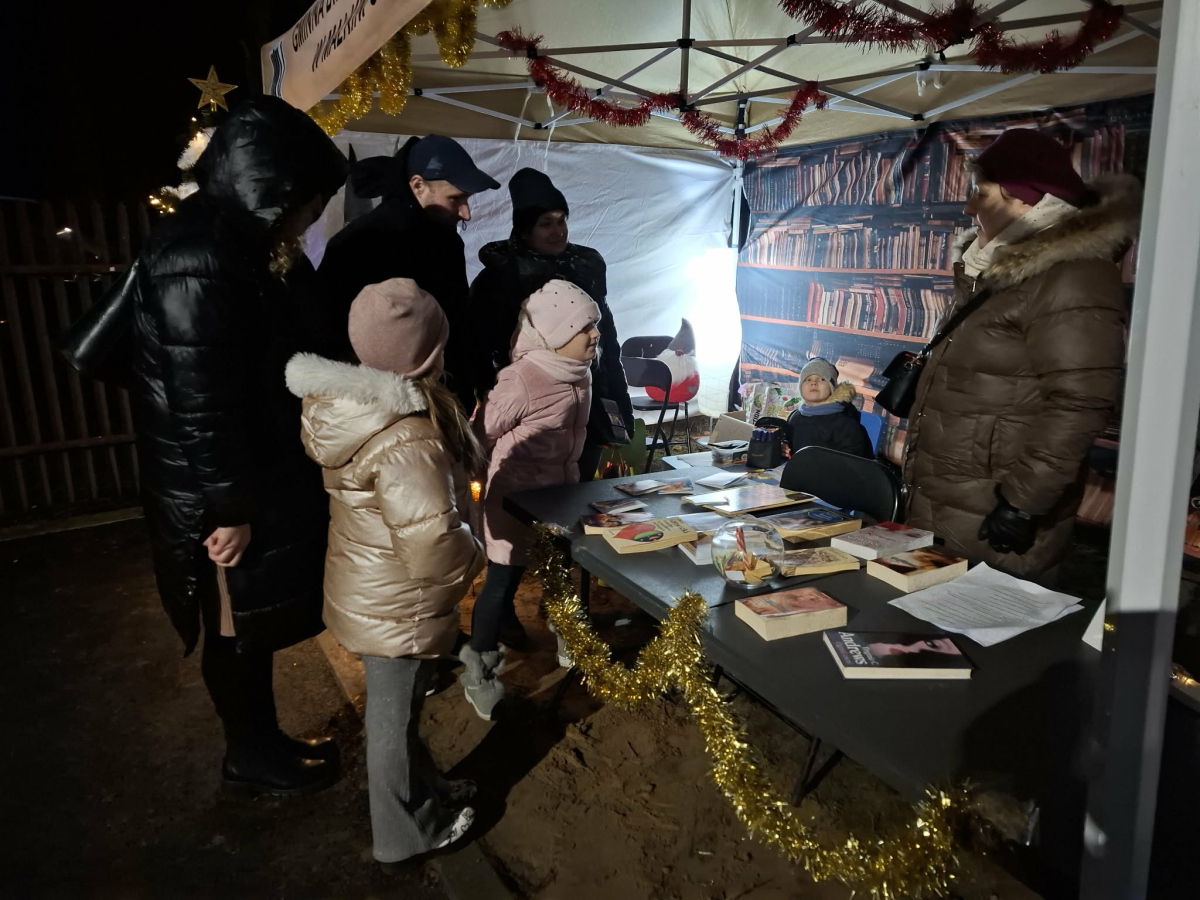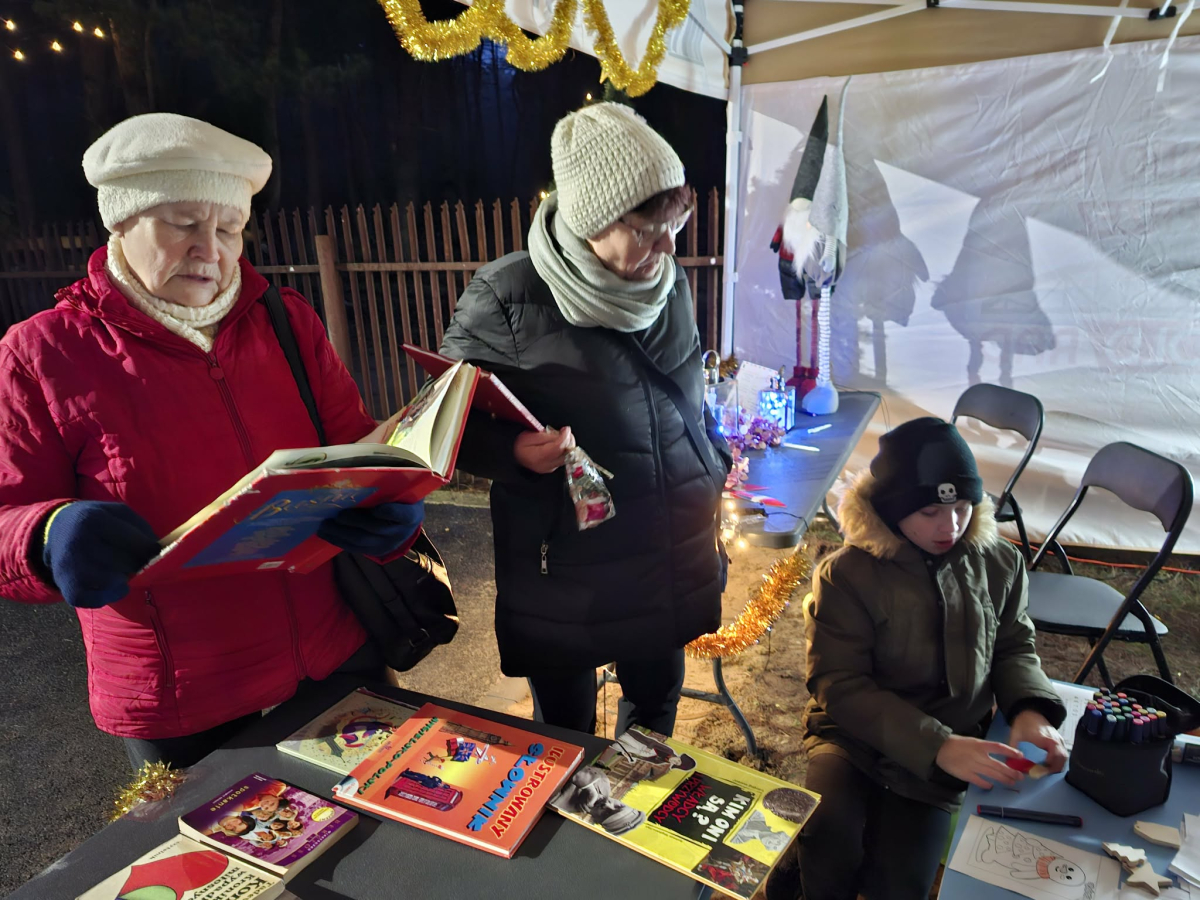 W czasie trwania Jarmarku biblioteka przeprowadziła różnorodne atrakcje i zabawy edukacyjne. Były zagadki, rebusy, losowanie pytań, kolorowanki, a także ozdabianie bombek ze sklejki, które można było zabrać ze sobą do domu - wszystkie te działania cieszyły się ogromnym zainteresowaniem. Za poprawne wykonanie zadań uczestnicy otrzymywali słodki upominek lub mogli wybrać książkę, co sprawiało wiele radości zarówno najmłodszym, jak i dorosłym.
