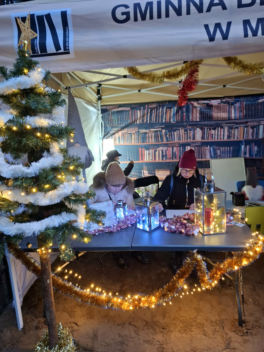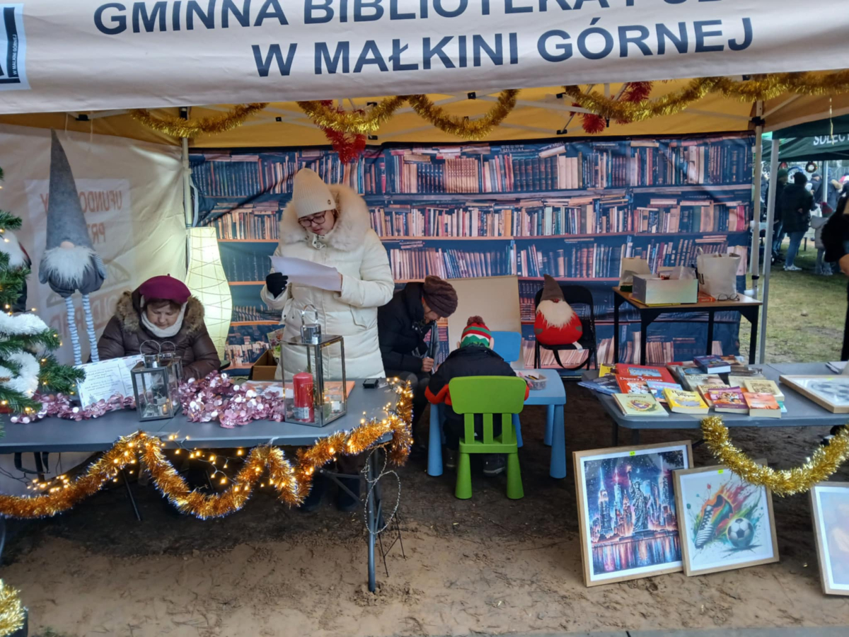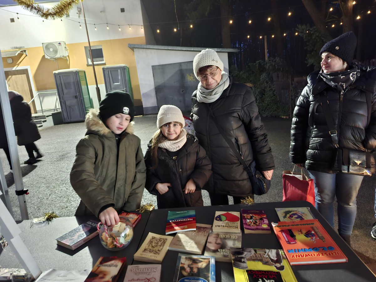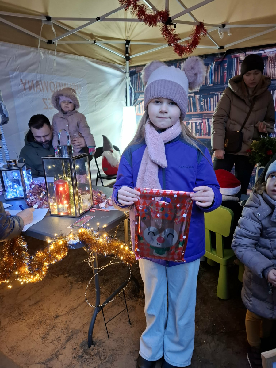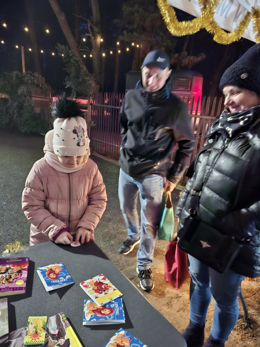 W czasie trwania Jarmarku biblioteka przeprowadziła różnorodne atrakcje i zabawy edukacyjne. Były zagadki, rebusy, losowanie pytań, kolorowanki, a także ozdabianie bombek ze sklejki, które można było zabrać ze sobą do domu - wszystkie te działania cieszyły się ogromnym zainteresowaniem. Za poprawne wykonanie zadań uczestnicy otrzymywali słodki upominek lub mogli wybrać książkę, co sprawiało wiele radości zarówno najmłodszym, jak i dorosłym.