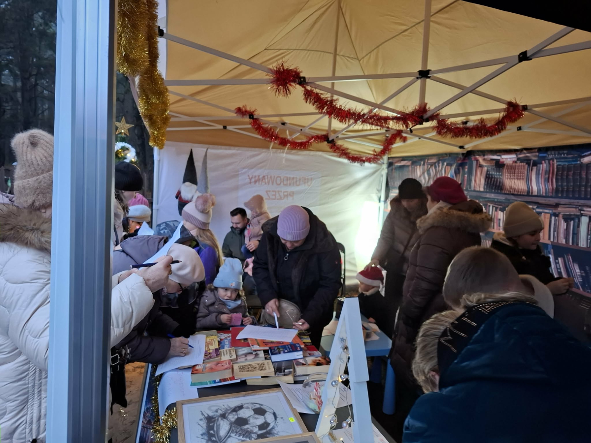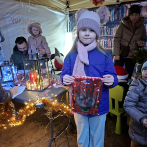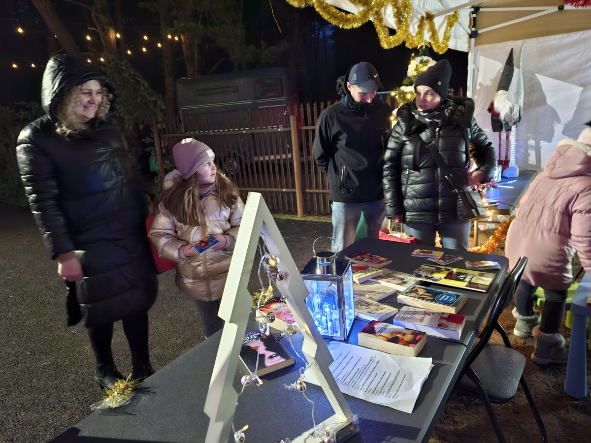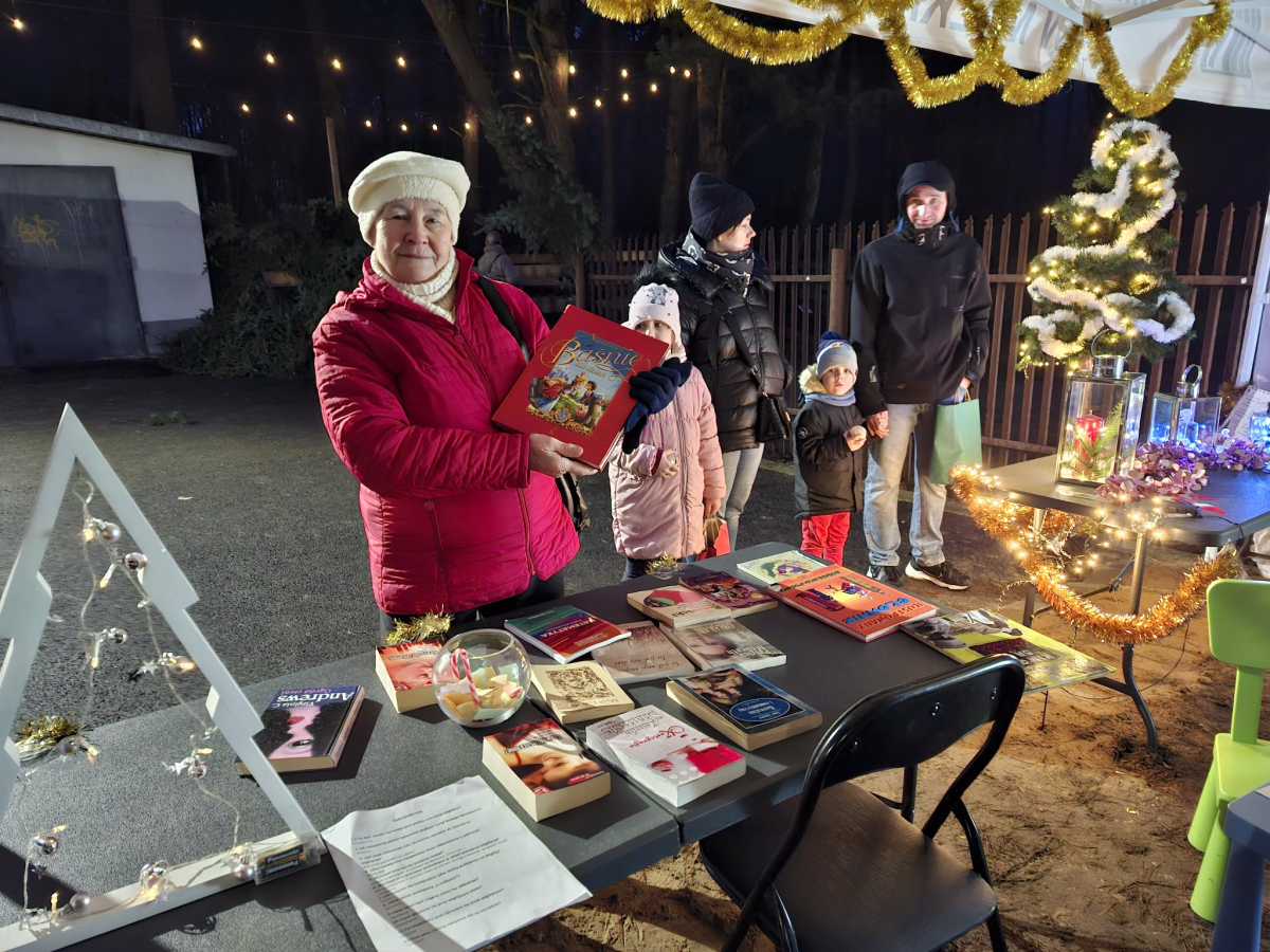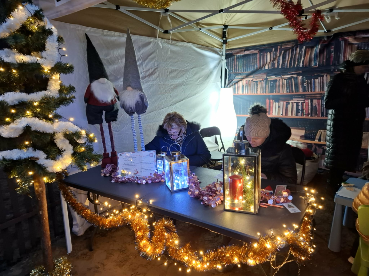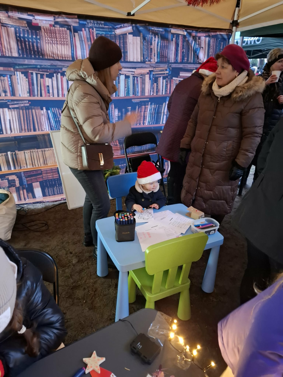 W czasie trwania Jarmarku biblioteka przeprowadziła różnorodne atrakcje i zabawy edukacyjne. Były zagadki, rebusy, losowanie pytań, kolorowanki, a także ozdabianie bombek ze sklejki, które można było zabrać ze sobą do domu - wszystkie te działania cieszyły się ogromnym zainteresowaniem. Za poprawne wykonanie zadań uczestnicy otrzymywali słodki upominek lub mogli wybrać książkę, co sprawiało wiele radości zarówno najmłodszym, jak i dorosłym.