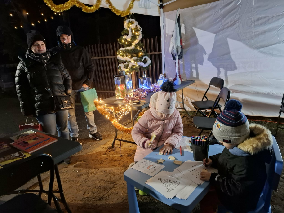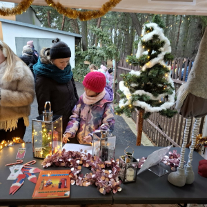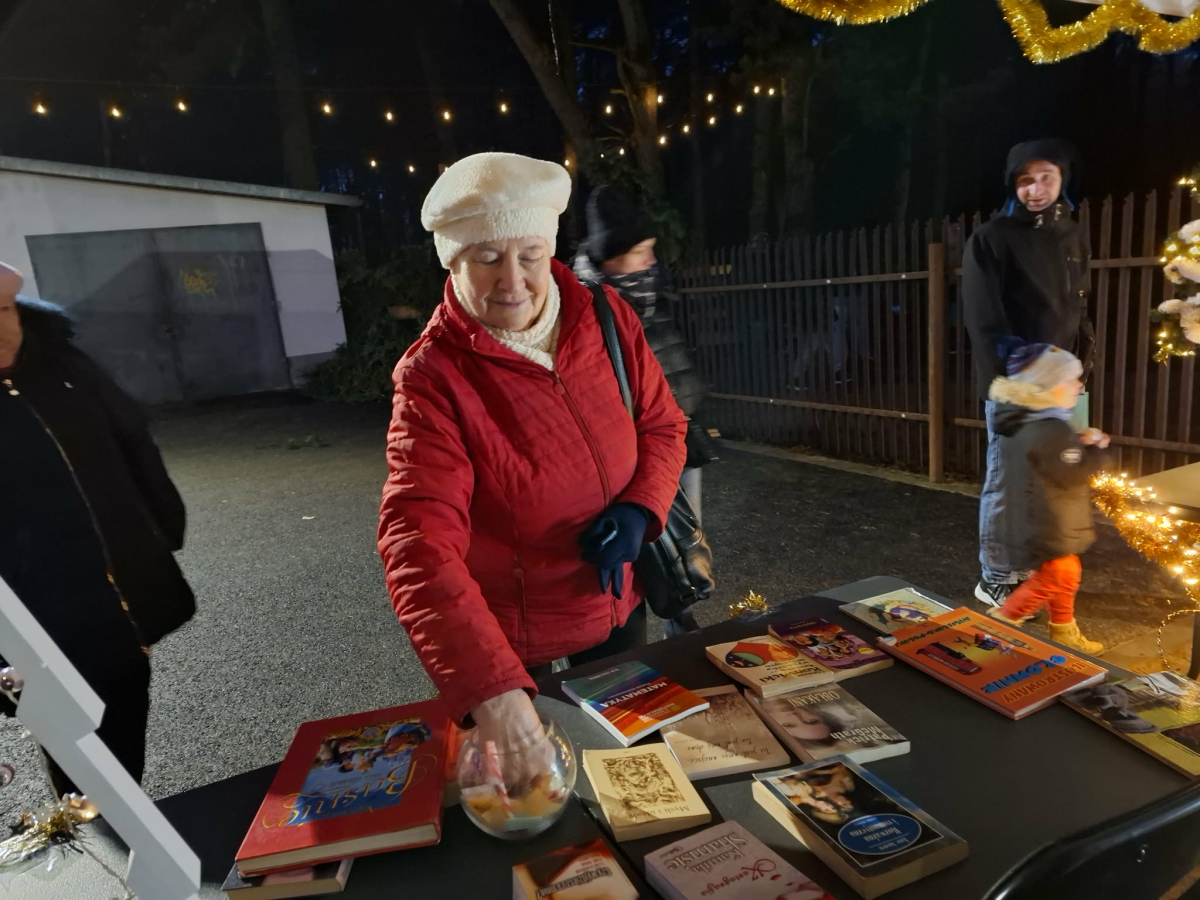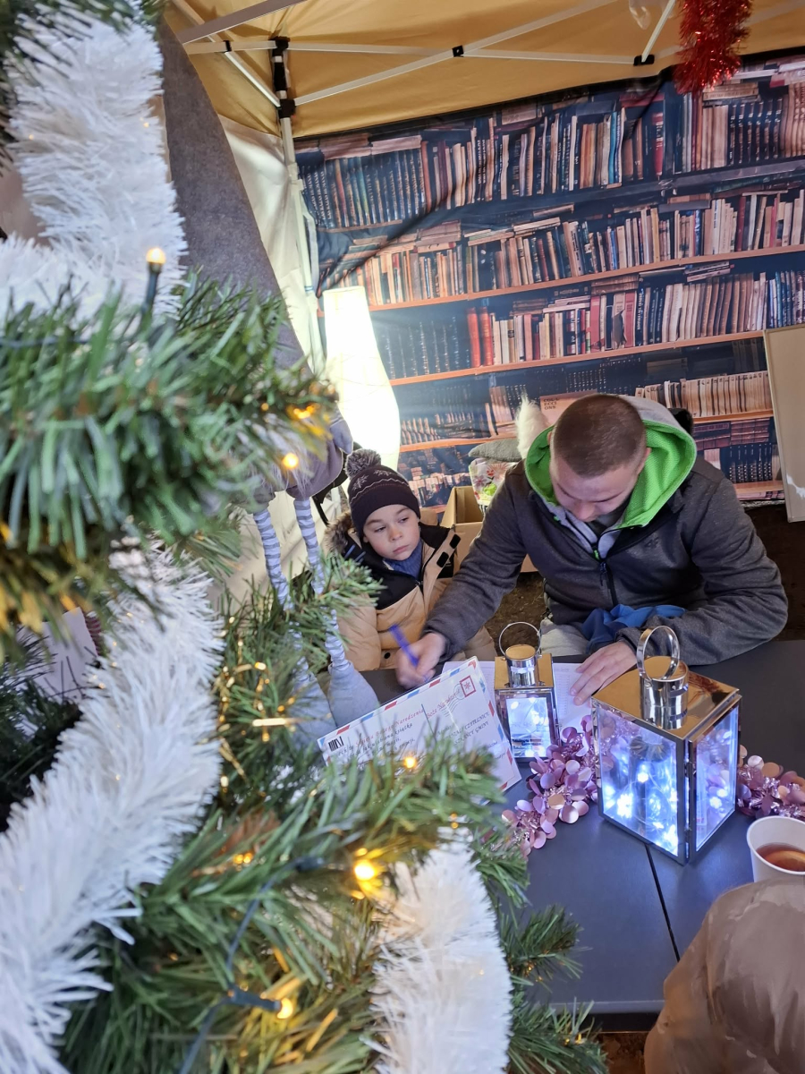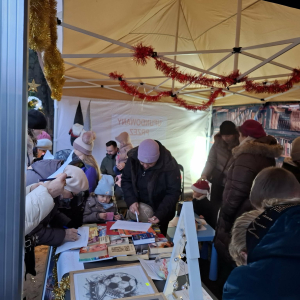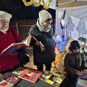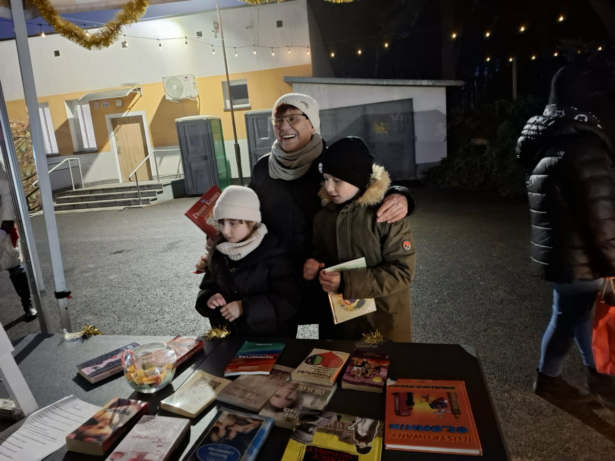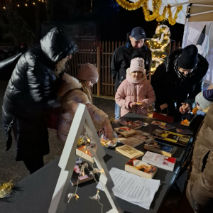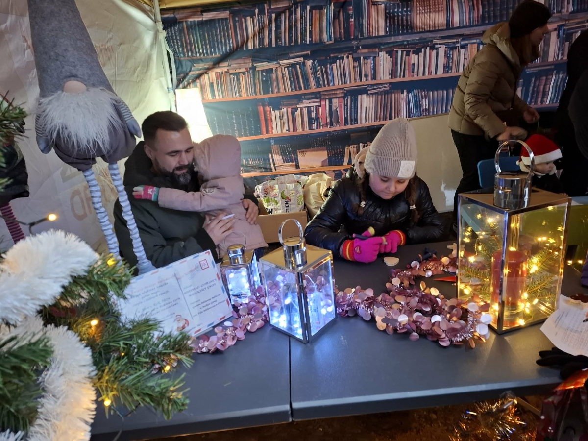W czasie trwania Jarmarku biblioteka przeprowadziła różnorodne atrakcje i zabawy edukacyjne. Były zagadki, rebusy, losowanie pytań, kolorowanki, a także ozdabianie bombek ze sklejki, które można było zabrać ze sobą do domu - wszystkie te działania cieszyły się ogromnym zainteresowaniem. Za poprawne wykonanie zadań uczestnicy otrzymywali słodki upominek lub mogli wybrać książkę, co sprawiało wiele radości zarówno najmłodszym, jak i dorosłym.