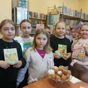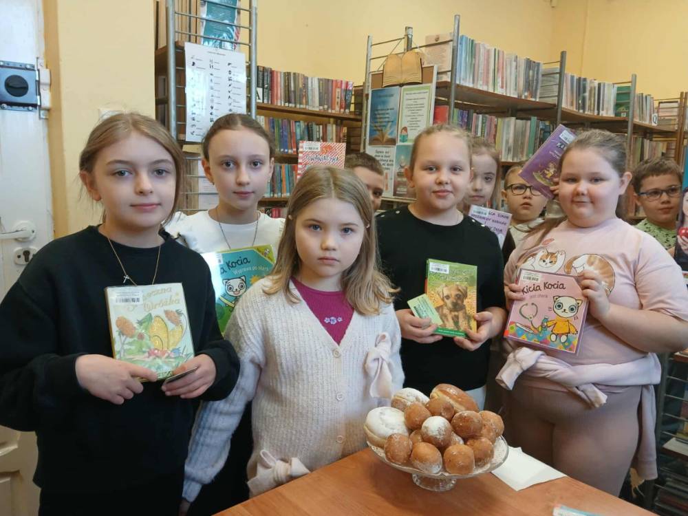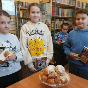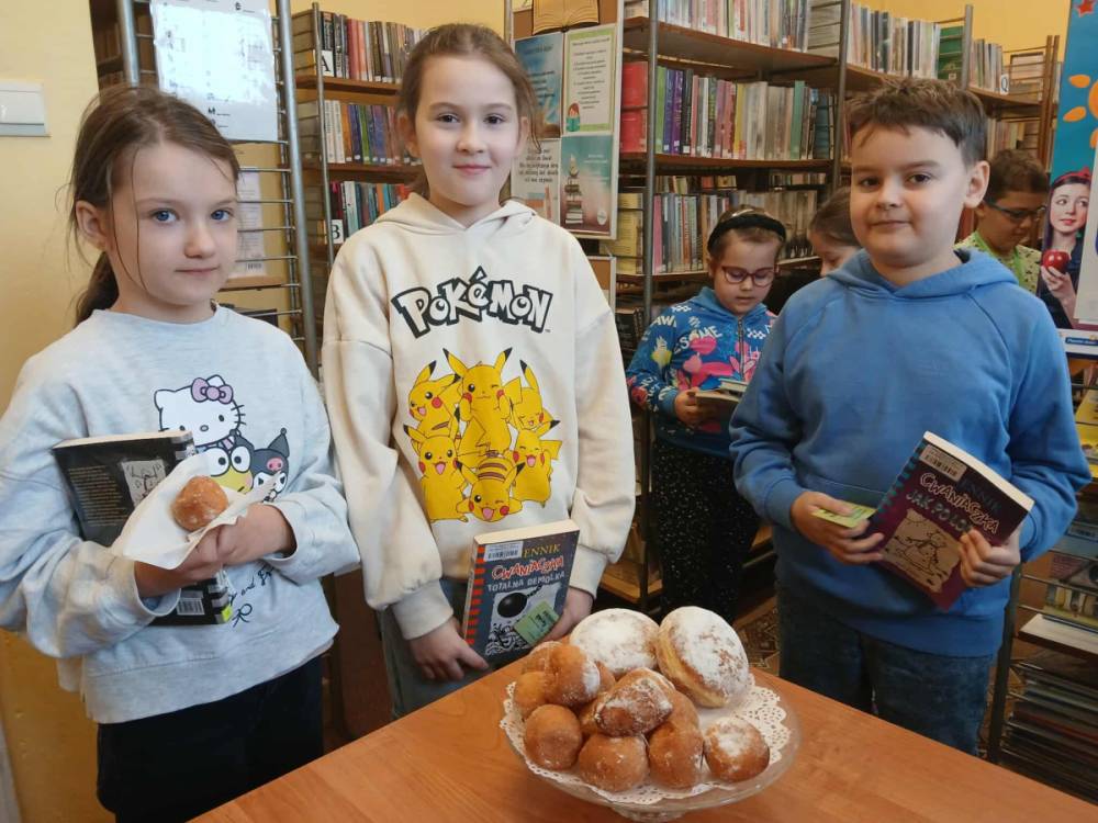 Dzieci opuściły bibliotekę zadowolone, uśmiechnięte i bogatsze o nowe doświadczenia. Przez cały dzień na Czytelników czekały słodkie niespodzianki - świeże, pachnące pączki, które umilały wizytę w bibliotece.