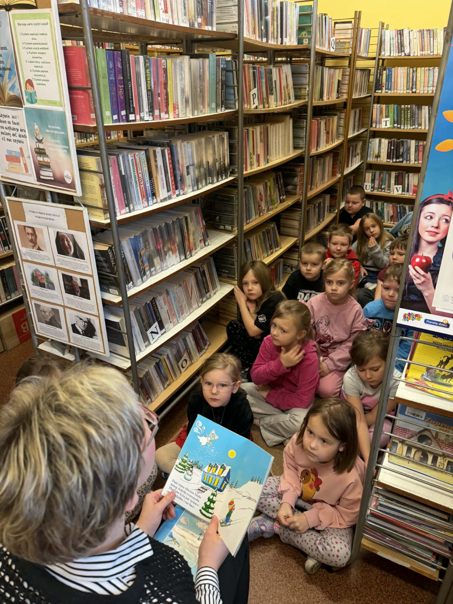 Podczas wizyty mali goście z zainteresowaniem wysłuchały wierszyków o zimie . Opowieści wprowadziły wszystkich w radosny, zimowy nastrój i zachęciły do sięgania po książki.
