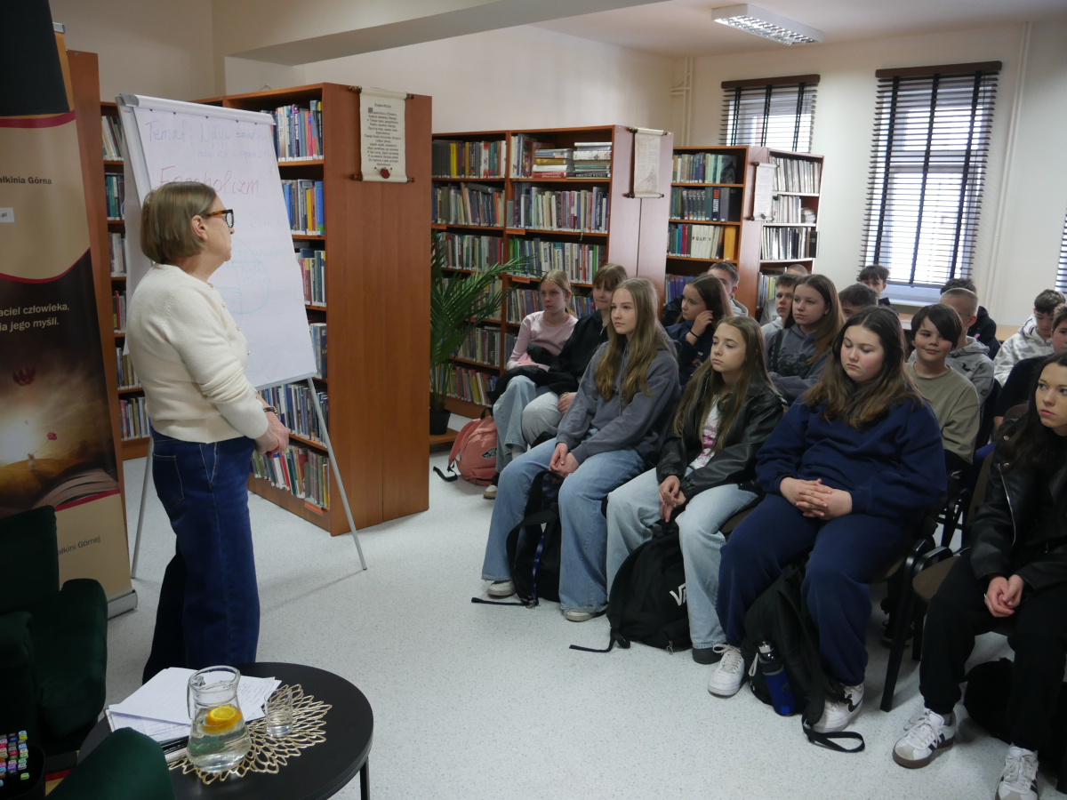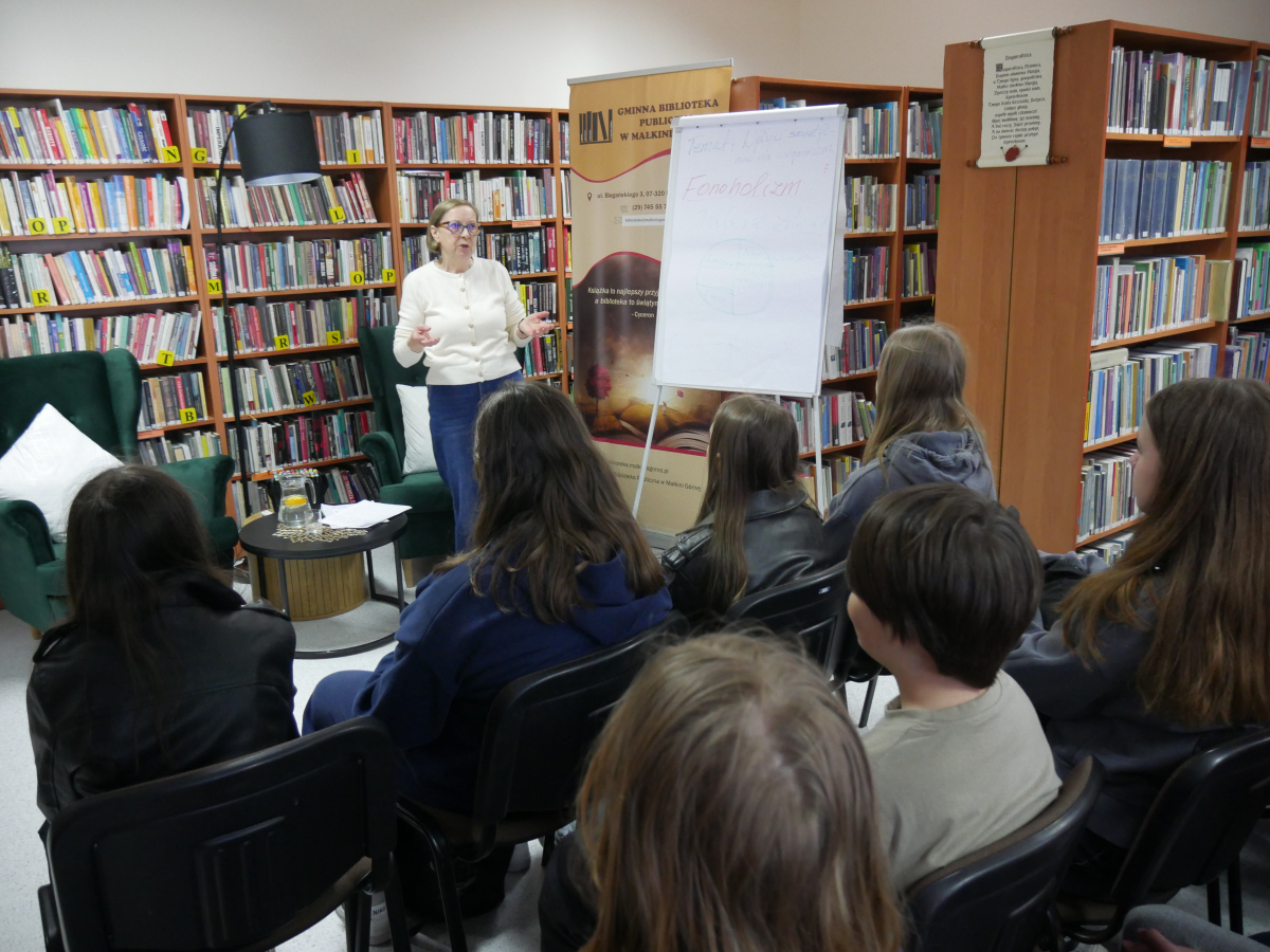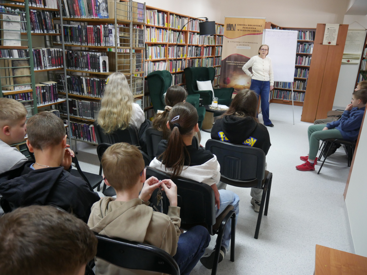 24 kwietnia 2026 r. w Gminnej Bibliotece Publicznej w Małkini Górnej odbyło się spotkanie edukacyjne z udziałem pani Anny Ferenc dietetyk,emerytowanej nauczycielki i specjalistki w zakresie żywienia oraz uczniów klas VI i VII ze Szkoły Podstawowej nr 2 w Małkini Górnej, którego tematem był „Wpływ smartfonów na organizm człowieka”.
