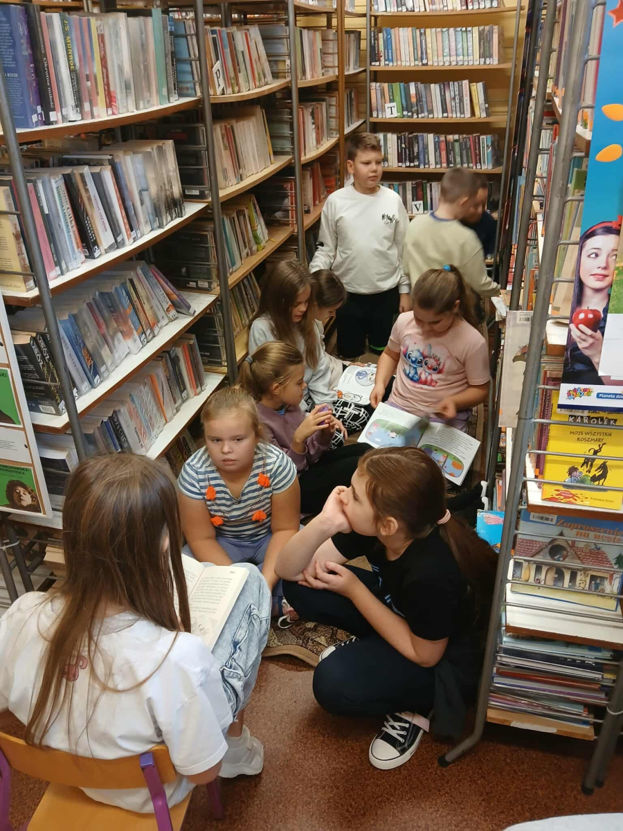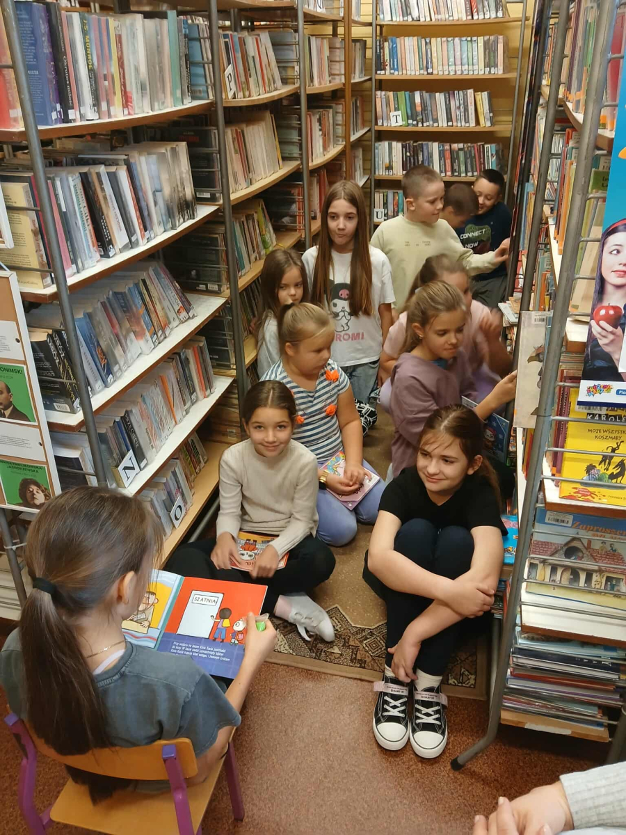 Uczniowie klasy IV Szkoły Podstawowej w Prostyni w bibliotece